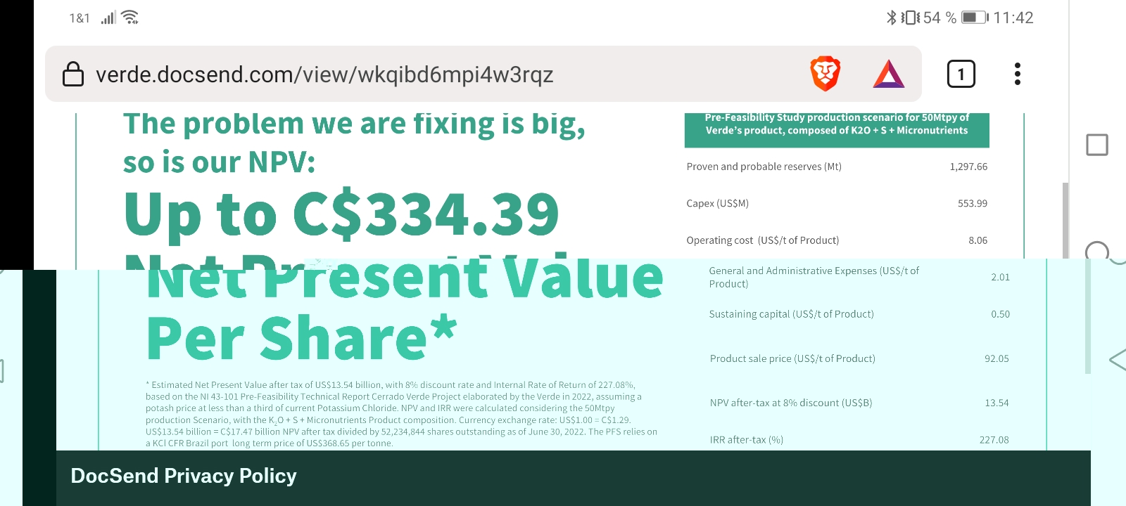 War da gerade und habe mir das Deck (Präsentation) angeschaut man muss da zwar seine E-Mail angeben und von 68 Folien sind natürlich einige bekannt. Es gibt da aber auch Folien zur geplanten Erweiterung und den shareprice den Verde für sich selbst errechnet. Klar da ist natürlich ein bias drin sich selbst einen Wert zu berechnen, sie tun das mit einem Drittel des heutigen Potash Preises, was die Rechnung ein gutes Stück konservativ macht. Auch klar wir werden nicht Morgen in solche Regionen kommen, wenn es klappt in ca 5 Jahren. Auch nicht klar ob der Markt diesen Wert abbildet, er bildet ja momentan auch nicht ab das Verdes Produktionskapazität von 600t auf 3 Mio gestiegen ist.