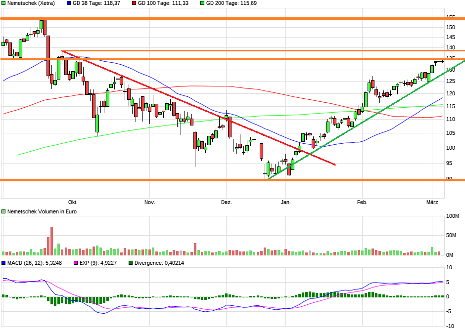 Nemetschek ist technisch eine Trendaktie, die fundamental überteuert ist. Da geht's darum, dass Trends gebrochen werden und dann weit tiefere Kurse realistisch werden. Fundamental ist Nemetschek sicherlich eher bei 80-85 € fair bewertet. Und da kommen wir auch wieder hin sobald der Markt im allgemeinen etwas stärker schwächelt.