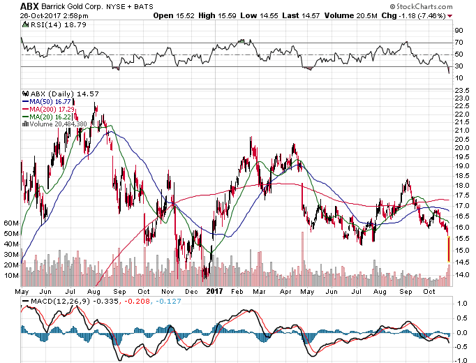 Die Zahlen sind in etwa ähnlich jenen von Q1/2017, und damals ging es daraufhin ca. 16 % in 8 Tagen runter (synchron zum fallenden Goldpreis) und Barrick lag etwa 10 % höher als momentan.