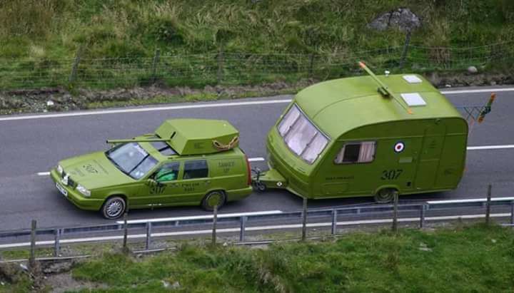 mit dem Platten Reifen links am Camper.