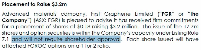 Platzierung zur Beschaffung von 3,3 Millionen Dollar First Graphene Limited ("FGR" oder "das Unternehmen") (ASX: FGR), ein Unternehmen für hochmoderne Werkstoffe, meldet, dass das Unternehmen die festen Zusagen für eine Platzierung von Aktien zu einem Preis von 0,18 Dollar für insgesamt 3,2 Millionen Dollar erhalten hat. Die Ausgabe der 17,7 Millionen Aktien und Optionen liegt gemäß Listing Rule 7.1 (Notierungsvorschrift der ASX) im Rahmen der Unternehmenskapazität und benötigt nicht die Zustimmung der Aktionäre. Jeder ausgegebenen Aktie wird eine FGROC-Option im Verhältnis 1:2 angefügt.
