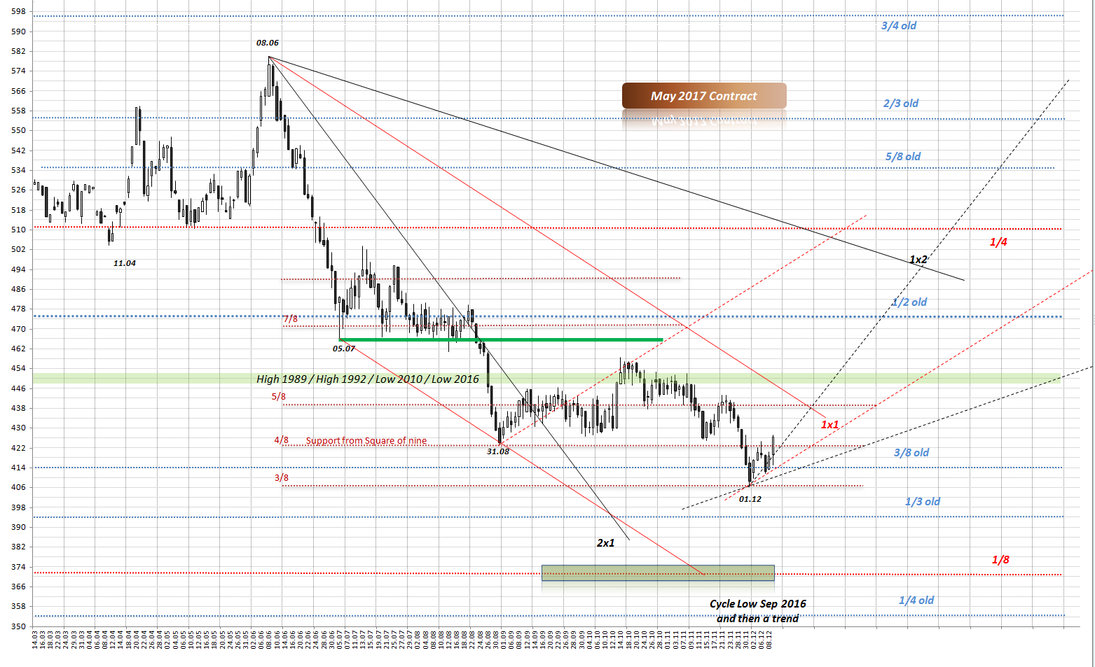 Aus diesen Zahlen liegt 1/2 Gann Linie bei 34,17 US Cent. Im Feb 2011 machte Zuckerpreis ein Hoch bei 36,08 und fiel wieder.