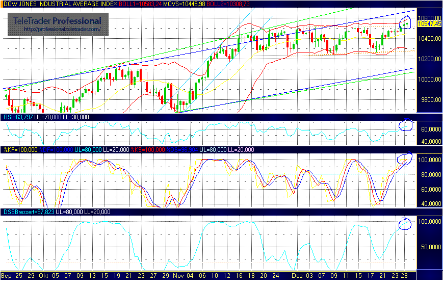 morleene: ein charttechniker würde den Chart von flatfee (unter "normalen" Umständen) so interpretieren, daß der Dow sehr stark korrekturgefährdet ist (bis etwa 10300, unteres BB).