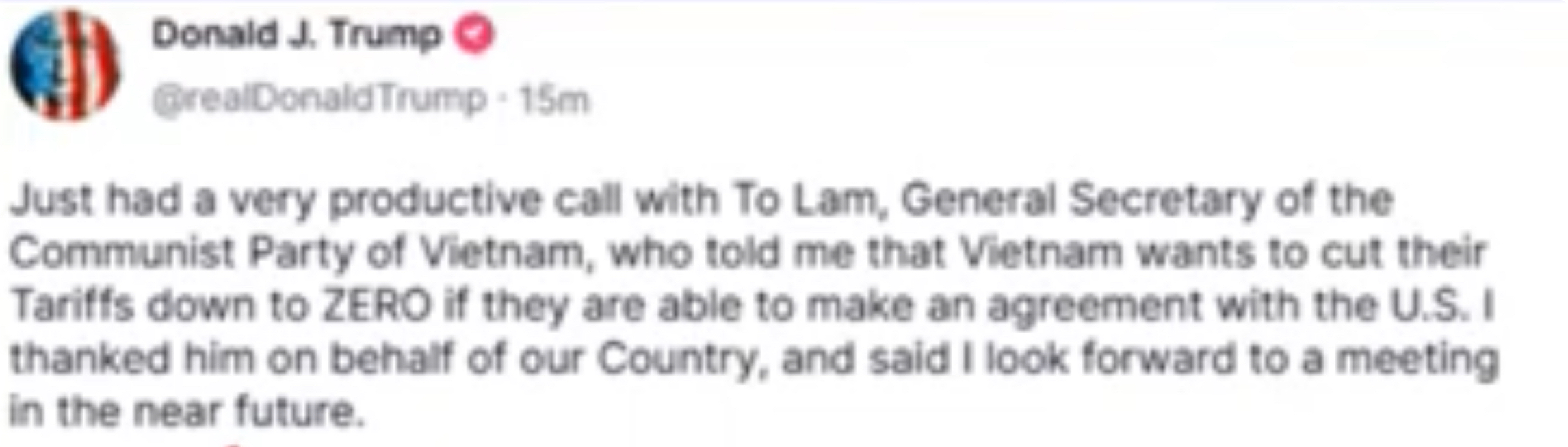 ..."He highlighted a recent decree, issued on March 31, slashing 23 tariff lines on goods imported from the U.S., many now at 0%, as proof of Vietnam’s government."...