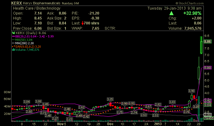 29-Jan-13 07:49 ET In Play Keryx Biopharma target raised to $13 at Stifel Nicolaus; patent possibilities interesting (6.06 ) : Stifel notes, following Monday's P3 Zerenex data announcement, it's increasing its peak dialysis sales estimate to approximately $550-600 mln. Its new target price of $13/share (from $4) 1) incorporates these model changes; 2) includes the potential that today's data may also provide an opportunity to meaningfully extend Zerenex's patent exclusivity; and 3) continues to exclude any pre-dialysis sales from its model. 29-Jan-13 07:19 ET In Play Keryx Biopharma target raised to $11 at Burrill Institutional Research; positive Phase 3 results – take out potential (6.06 ) : Burrill Institutional Research raises their KERX tgt to $11 from $6 based on a discounted revenues and earnings per share valuation methodology. Yesterday, Keryx announced clinically meaningful and statistically significant results from the company's Phase 3 trial evaluating Zerenex for hyperphosphatemia in end-stage renal disease (ESRD) patients. Based on the clinically differentiated profile demonstrated in the Phase 3 clinical study, firm believes Keryx should be able to compete in the $1.5 B worldwide market for phosphate binders in the dialysis setting.