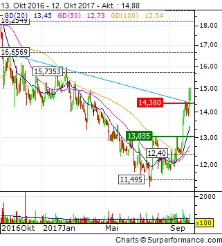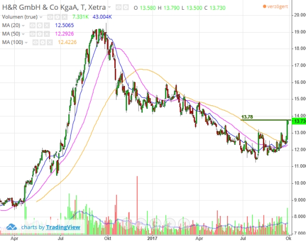 Die Hurrikan Saison im September mit Tropensturm Harvey und Irma hat bei der H&R Öl Raffineriezweigstelle in Housten Texas vermutlich zu Lieferengpässen geführt d.h. die erhöhte kurzfristige Risikoeinstufung der Aktie lohnt zum Kauf. Der Sommer aufkommende Hype um Elektroautos auch durch Wahlpropaganda und der fallende Ölpreis hat die Ölindustrie kurzzeitig gebremst. Studie der Verbraucherzentrale in Berlin bestätigt nun die Unwirtschaftlichkeit von Elektromobilität gegenüber Gasantrieben. Die Chemiebranche will auch durch Übernahmen weiter wachsen. Nach dem Tropensturm müssen Häuser, Autos und Infrastruktur wieder aufgebaut werden und die Ölraffinerien werden unter Volllast produzieren müssen um die steigende Nachfrage zu bewältigen. Hier bietet sich nächste Woche mal wieder eine günstige Einstiegsmöglichkeit. Besser H&R bei 12 EUR kaufen als in Zukunft bei 20 EUR. Letzte investmentstarke Bundesländer Bayern und Baden-Württemberg sind aus den Sommerferien dieses Wochenende zurück. Bei H&R GmbH & Co. KGaA stehen Investorenmessen noch an und dritte Quartalszahlen werden am 15.November bekanntgegeben. Legt man das Lineal an den Jahreschart von H&R an kann man bereits seit Juli 2017 einen intakten Aufwärtstrend feststellen wie in der gesamten Chemiebranche zurzeit erfolgt. Deutsche Aktien sind immer noch Preisgünstig gegenüber amerikanischen Aktien und die IWF hat die Wachstumsprognose bereits vor den Wirbelstürmen und der Umweltprämie in der Autoindustrie erhöht. Auch der norwegische Staatsfonds bleibt investiert und die Analysten sehen langfristig positives Potential. H&R hat seit dem Jahr 1860 schon mehrere Krisen überstanden. Es lohnt sich immer mehr auf die bereits im Forum genannten positiven Signale im jetzigen Umfeld zu setzen frei nach dem Motto schlimmer kann es nicht mehr kommen und die Bodenbildung bei 12 EUR hält stabil.