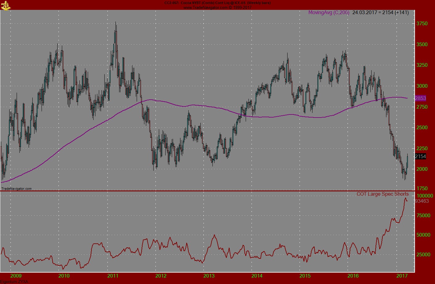 Kaum einer hier wird daran zweifeln, dass Kakao mittelfristig, d.h. innerhalb eines Jahres wieder deutlich über 2000 kommt. Da braucht man nur den langfristigen Chart anschauen.
