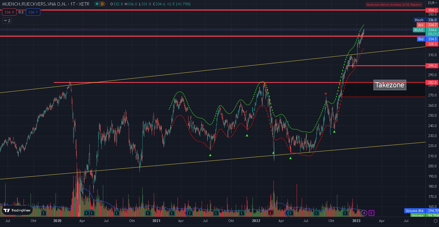 Die MüRü ist natürlich auch gut zuvor gelaufen, weil die Gesamtbörse bzw. der DAX sich stark erholt hat seit den Tiefs von Ende September 2022.. Zudem ist ein Umfeld stärkerer Zinsen für Werte aus dem Finanzbereich immer vorteilhafter. Man sieht ja auch, daß Bankenwerte die letzten Tage sehr gut anzogen. Und zudem sind richtige Großschäden auch in der letzten Zeit nicht mehr eingetreten auf den letzten Metern des Jahre 2022, die vielleicht noch eine hohe Divi-Ausschüttung nach der nächsten HV gemindert hätten. Rein vom Langzeit-Chart her läuft man weiter Richtung des Allzeithochs und hat jetzt die Widerstandsregion der jüngsten Zeit dynamisch durchbrochen. Sowas hat natürlich heute auch die Käufe bei der Aktie mitangekurbelt. Sollte man vielleicht nochmal einen Pullback daran machen, dann wäre es auch kein Problem. Vielleicht sogar eine Nachkaufchance. Allerdings dann mit nicht zuviel Spielraum nach unten absichern. Denn Börse ist kein Selbstläufer und Absicherung immer ratsam.