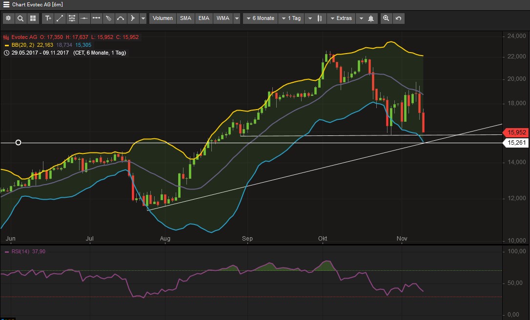 Vielleicht sehen wir ja in den nächsten Tagen eine größere Marktkorrektur. Kann mir gut vorstellen, das der starke Einbruch am Gesamtmarkt viele dazu verleitet, in Angst vor weiteren Buchverlusten ihre immer noch üppigen Gewinne bei zahlreichen gut gelaufenen Werten einzustreichen und sich erstmal an der Seitenlinie positionieren. Evotec ist erstmal genau auf den Aufwärtstrend gelaufen und ist leicht nach oben abgeprallt, wäre wünschenswert, dass dieser morgen ebenfalls hält. Ansonsten gibt es hier dann charttechnisch noch weitere Rückfallpotenzial, vorallem im Falle eines schwächelnden Gesamtmarktes.
