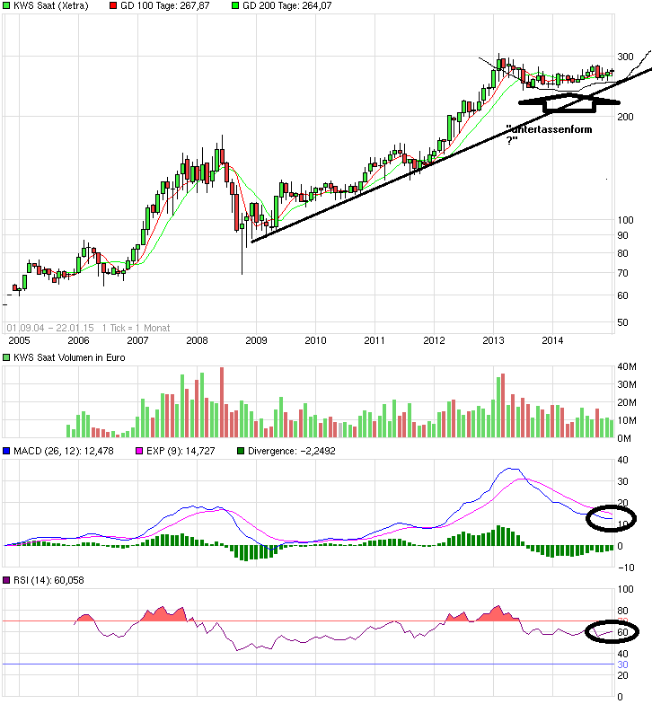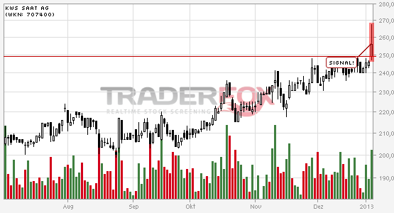 Die Aktie von KWS Saat befindet sich in einer langfristigen Aufwärtsbewegung. Im Rahmen dieser Bewegung zog die Aktie auf ein Hoch bei 201,85 Euro an. Dieses Hoch überwand die Aktie Ende Juli 2012. Damit ergab sich ein Kaufsignal, das die Aktie zu einer Rally auf ca. 250,00 Euro veranlassen sollte. Diese Rally ist aktuell im Gange. Ein Rückfall unter 201,85 Euro würde diese Rally aber vermutlich abwürgen.