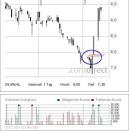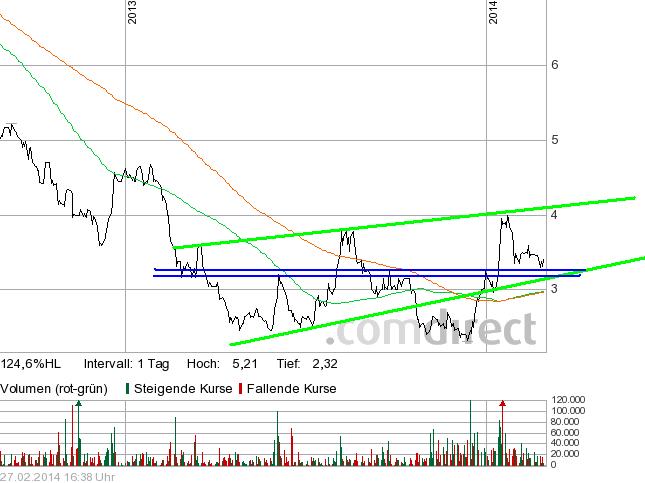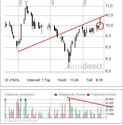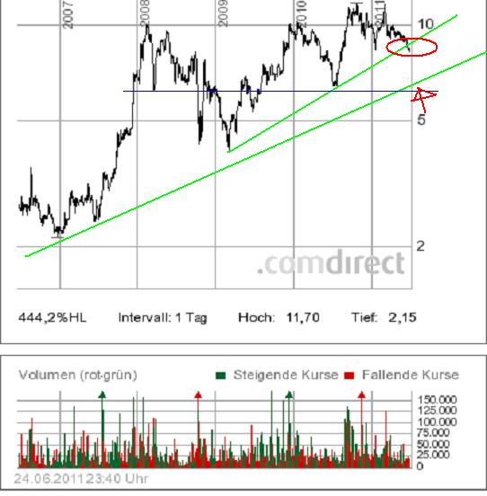 ähnlich stark drängt sich der rote Abwärtskanal auf, der lediglich im März durch Push-Aktionen und extrem überbewertete Infos mit einem Verarschungstop gebrochen wurde...
