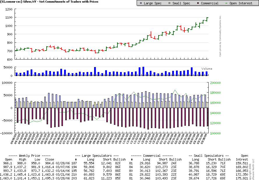 Die COT-reports von gestern zeigen ein stark uneinheitliches Bild: die commercials sind short, während die large und small cap long sind, wobei erwähnt werden muss, dass die large caps ihre short positionen ausbauen(http://news.silverseek.com/COT/1144438725.php);bei Gold haben wir ein noch grössere Polarisation: auch hier sind die commercials short und die large/small caps long, aber mit dem Trend, dass die large caps ihre long positionen vergrössern(http://news.goldseek.com/COT/1144438800.php).