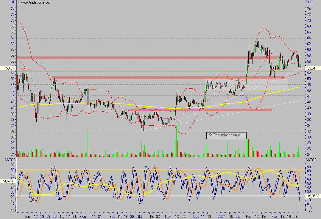 Conergy befindet sich in der Korrektur, es ist die Frage welcher Move korrigiert wird, derzeit sieht es für mich aus, als würde sie zunächst nur den letzten Move korrigieren um dann das Top zu erreichen oder zu überbieten. die rechnerischen Ziele für diese Korrektur liegen bei 56,50 und 54,25, das Supportziel liegt ebenfalls bei 56,50 und wurde bereits knapp erreicht, ein weiter, dicker Support liegt um 50,50 und sollte möglichst nicht erreicht werden, sonst wird der Komplettmove bereits jetzt korrigiert.