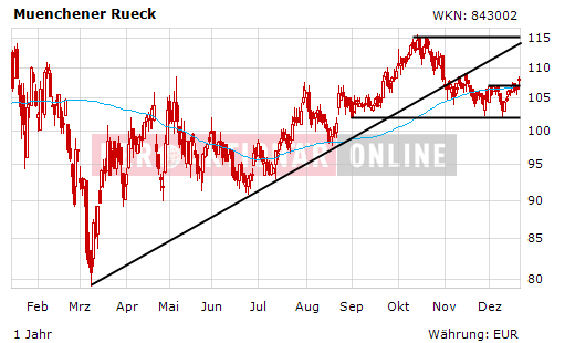 Mitte Oktober prallten die Papiere von Munich RE bei 115 Euro ab und fielen anschließend unter den langfristigen Aufwärtstrend. Danach scheiterte die Aktie im November zweimal an der Rückeroberung des Trends und verlor weiter an Wert bis auf 103 Euro. Seitdem hat sich der Titel wieder etwas erholt und ist auf dem besten Weg die Widerstandsbereiche bei 107,00 und 108,00 Euro hinter sich zu lassen. Dabei hat das Papier bereits die 90-Tage-Linie nach oben durchbrochen, was zusätzlichen Auftrieb gibt.