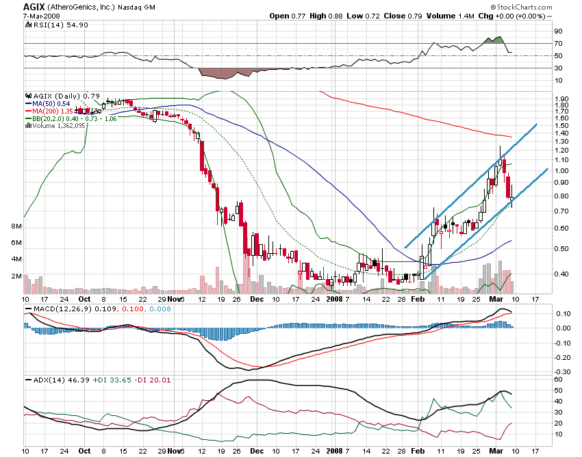 Die Aktie stieg (wie im Chart zu sehen) von 0,35 Dollar auf 0,60 Dollar und lief dann seitwärts.Dann kam der Ausbruch und der war heftig denn AGIX schnellte auf Tageshoch 1,25 Dollar und schloß bei Tage drauf bei 1,10 Dollar(höchster Schlußkurs seit 4 Monaten).