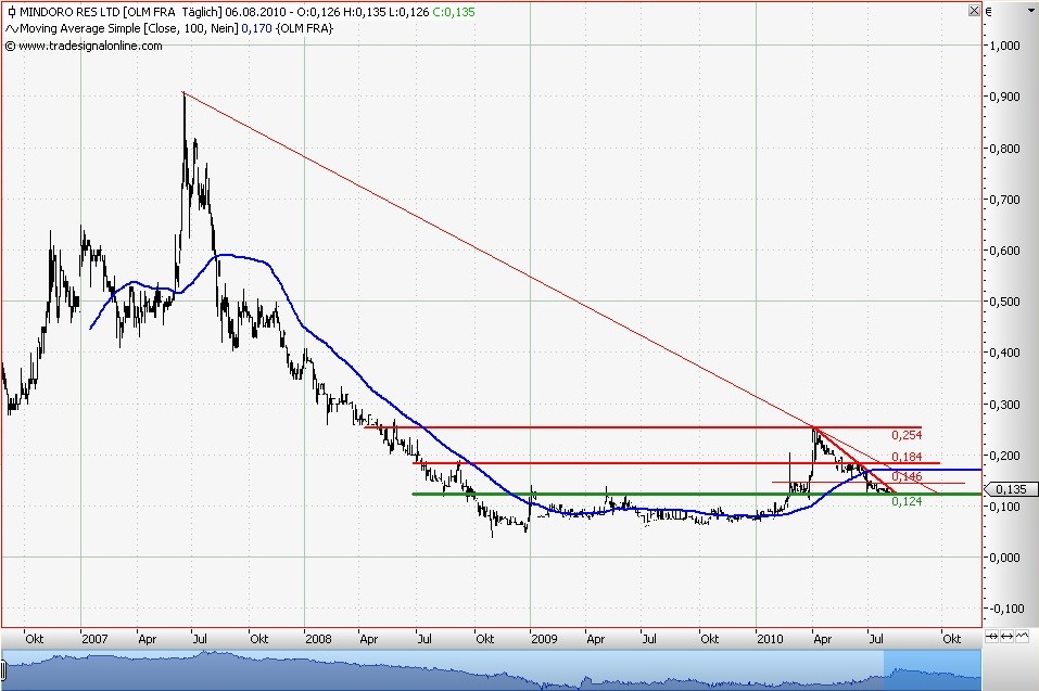 Der Heutige Anstieg ist eine Folge der charttechnischen Unterstützung bei 0,124. Der Kurs ist an dieser Marke in den letzten Tagen schon öfter wieder nach oben abgeprallt. Diese Unterstützungslinie wurde nicht nachhaltig nach unten durchbrochen. Damit zeichnet sich nach dem langen Abwärtstrend der seit Anfang April anhält nun langsam eine Bodenbildung, mit Übergang in einen Seitwärtstrend ab. Um aus diesem auszubrechen sollten nun news folgen die den Kurs in Richtung Norden bewegen. Dabei stellt sich einer möglichen Aufwärtsbewegung der erste Widerstand bei 0,146 entgegen. Bei 0,171 folgt die 100 Tagelinie, danach ein weiterer signifikanter Widerstand bei 0,184 und zuletzt nochmals bei 0,254, das war die Spitze des Aprilausbruches. Auffällig ist der Heutige Kursanstieg deswegen, weil sich über ihm gerade die 100 Tagelinie und der Langfristige Abwärtstrend kreuzen, dass es gerade Heute zu steigenden Kursen kam, kann kein Zufall sein und ist meiner Meinung nach auffällig positiv, denn damit ist der langfristige Abwärtstrend klar gebrochen. Bis zu 0,50 hat der Kurs dann relativ freie Bahn. Sind erst einmal die kursnahen Widerstände zu Unterstützungen geworden kann es bis zum Jahresende noch sehr interessant weitergehen mit Mindoro, wenn entsprechender newsflow zur Unterstützung beiträgt.