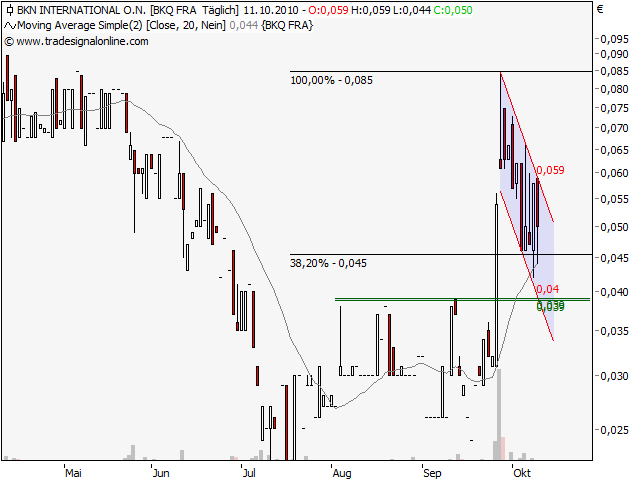 Bei ca. 0,04€ stützen die älteren Hochs und das 38,2% Fibonacci Retracement wurde bislang noch nicht per Tagesschlusskurs unterboten, außerdem unterstützt der GD20.