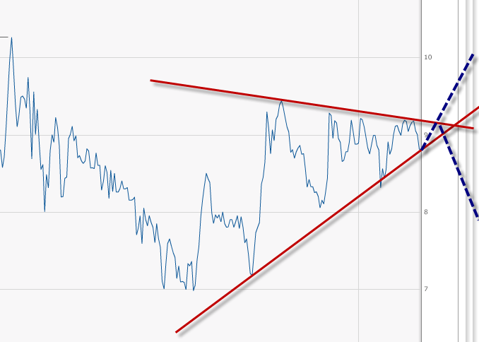 nach meinem bescheidenen Wissen über Charttechnik scheint mir, dass sich hier bald was Richtung Norden oder Süden tun sollte. Wobei meine Hoffnung natürlich nach Norden zeigt.