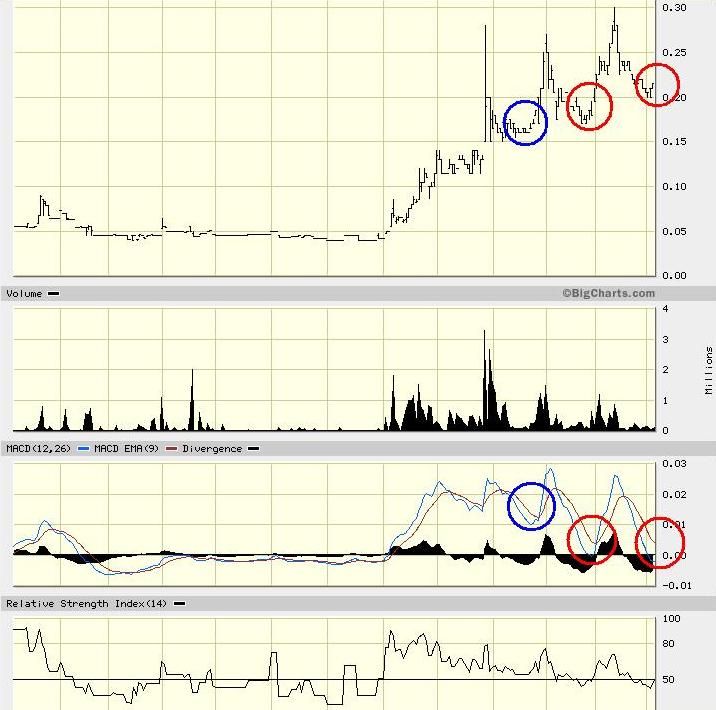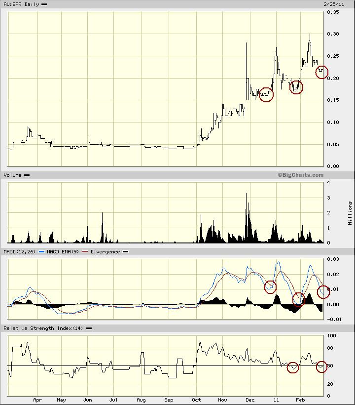So, nächste Woche sollte es wieder aufwärts... ...gehen. Genau die gleiche Ausgangssi­tuation wie beim letzten Lauf bis 0,30 AUD (siehe MACD). Wie beim letzten Mal ging der Kurs schon vor dem Kaufsignal­ nach oben (rote Kreise).