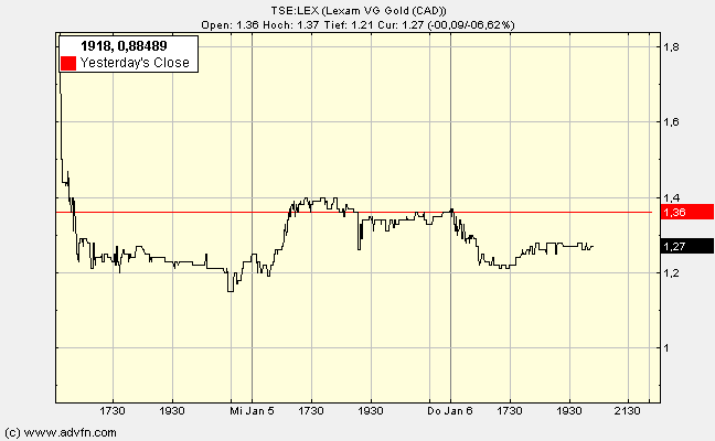 Der Kurs von Lexam VG Gold hält sich seit der Eröffnung in Canada zwischen 1,4 Can$ und 1,2 Can$. Ist dieser Kursbereich vielleicht ein warten bis in Deutschland wieder richtig gehandelt wird ? Könnte mir vorstellen, News folgen wenn der Handel bei uns wieder richtig läuft.