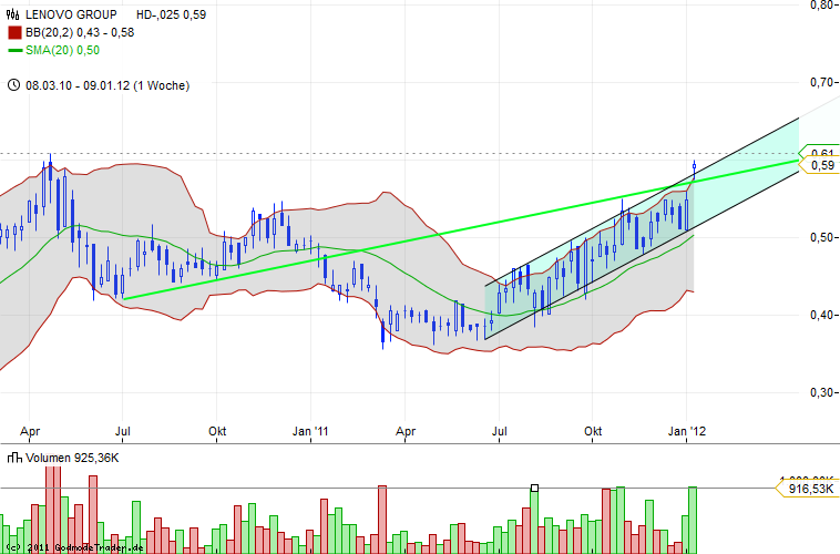 Peking 27.01.2012 (www.emfis.de) Die Analysten von UBS haben das Kursziel des chinesischen Computerherstellers Lenovo von 6,50 auf 7,00 Hongkong-Dollar heraufgesetzt. Die Aktie wird weiterhin mit Kaufen eingestuft.