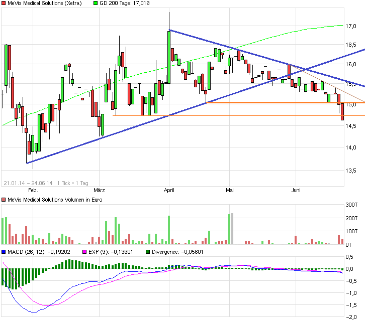 "Nach der erfolgten vorzeitigen Verlängerung des bestehenden Lizenzvertrags mit Hologic bis Ende 2015 konkretisieren wir jetzt unsere Gespräche mit Hologic über die weitere Zusammenarbeit und die zukünftige Entwicklungsunterstützung. Wir rechnen damit, noch in diesem Quartal eine vertragliche Einigung darüber zu erzielen." ergänzte Marcus Kirchhoff, Vorstandsvorsitzender der MeVis Medical Solutions AG.'' Beim Q1-Bericht am 19.5. fand diese Angelegenheit gar keine Erwähnung ... hm, der Ausblick2014 wurde bestätigt.