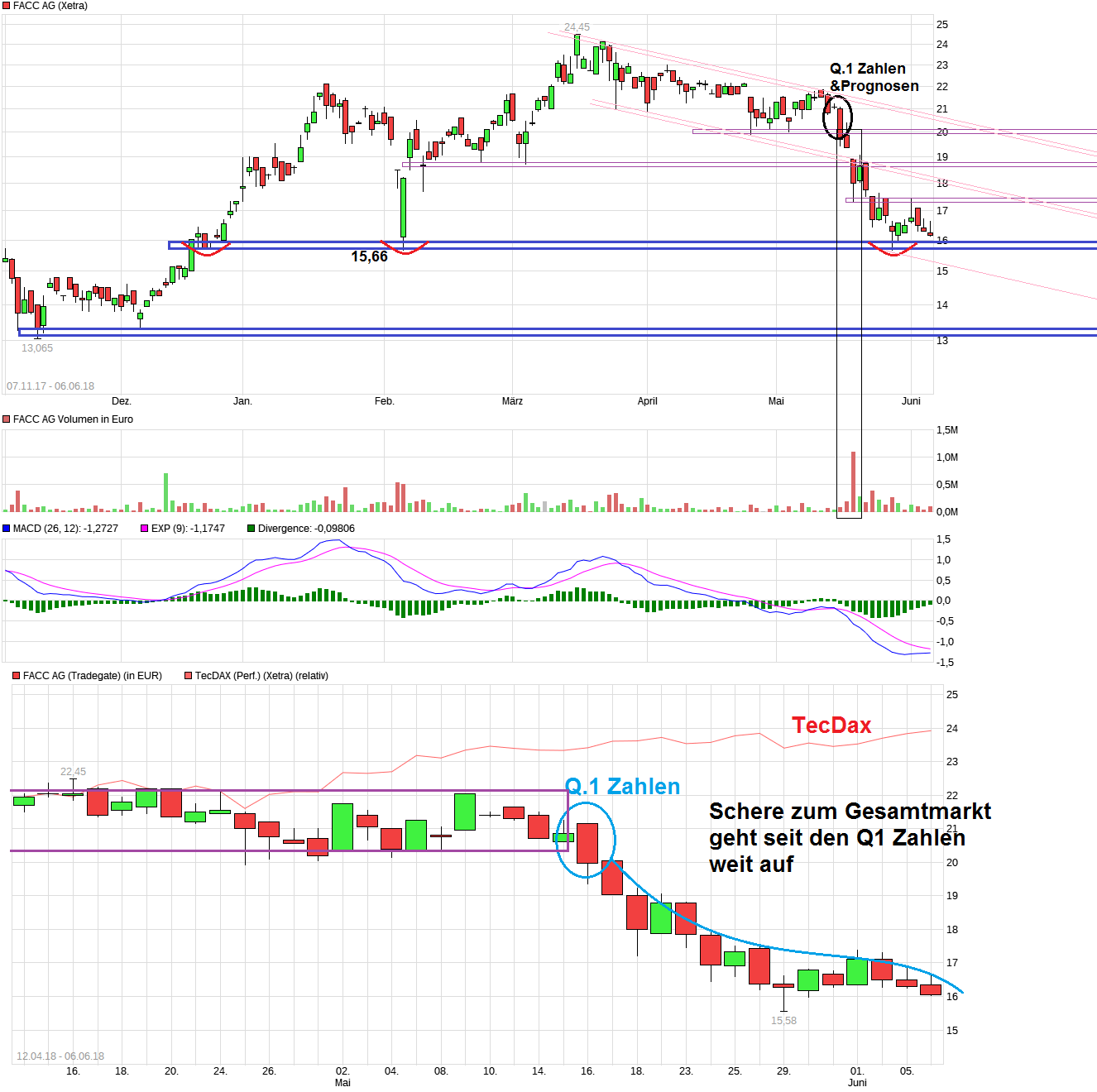 Wenn man hier noch länger neuaufflammende Eurozonen-Krise spielen sollte an der Börse und so noch deutlichere Überreaktionen nach unten kommen sollten im "Sommerloch" , dann könnte sich der Kurs von FACC vielleicht sogar noch dem seit Mitte 2016 steigenden Aufw.trend weiter annähern. Wären ja nurnoch wenige Euro bis dahin. Gemessen an der Größe die man seit dem Top von knapp 30€ bereits gefallen ist, wäre das auch keine große Sache mehr. Angesichts der extremen Steilheit der Kursanstiege seit Mitte 2016, ist es jedenfalls wenig überraschend, daß dann auch die wie immer auf den Fuß später folgende korregierende Gegenbewegung ebenfall von einer starken Form ist. Da die gegenwärtige Unternehmensprognose für das laufende Jahr lautet nur ein Umsatzwachstum im eher bescheidenen einstelligen Prozentbereich zu haben, ist es auch eigentlich nicht ungesund, wenn die Bewertung sich wieder etwas sinnvolleren Regionen annähert. Da ist dann für Neu-/Wiedereinsteiger das Risiko überschaubarer bzw. das CRV wieder deutlich günstiger. Von daher könnte man ja auch mit gestaffelten Teilkäufen seine Postion aufbauen, z.B. im Bereich 13-16€. Könnte man jetzt schon eine erste Posi kaufen und in gewissen (1€) Schritten weiter aufbauen, falls es noch weiter südwärts geht. br>
