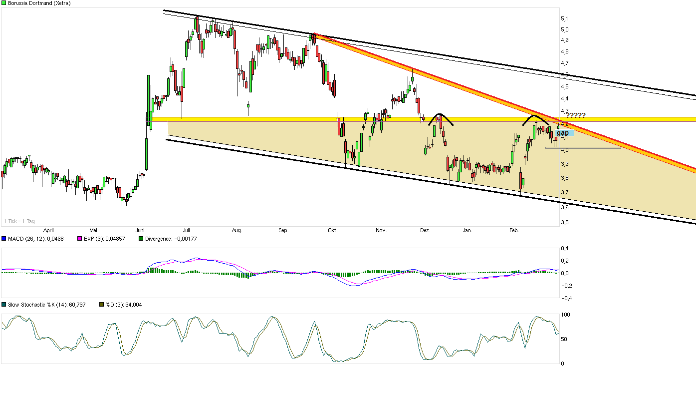 Vielleicht kümmert man sich ja auch kurzfristig erstmal noch in der nächsten Zeit um das Opening Gap von heute. Und ca. 50 Cent schneller Rebound in den letzten Wochen müssen auch vielleicht erstmal etwas wieder verdaut werden zwischenzeitlich. Von daher nicht so schlimm, wenn man etwas noch verschaufen würde, um damit wieder Kraft zu sammeln vor einer nächsten Stufe nach oben. Vor der Tür liegen jetzt der seit September fallende Abw.trend und auch kurz darüber der mehrfache horizontale Widerstand bei ca. 4,30. Die nachhaltig zu überwinden wäre nicht unwichtig als charttechnischen neuer Impuls. Denke die Bedeutung von Einzelspielresultaten in der BL für den Kurs könnte in der kommenden Zeit wieder etwas geringer werden als zu zuletzt in der Zeit wo man auf einem direkten Abstiegsplatz stand und die Nerven blanker waren als jetzt im gesicherten Mittelfeld.