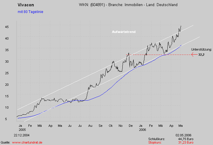 Das erste Quartal gelte in der Immobilienbranche allgemein eigentlich als eine relativ ereignislose Zeit. Vivacon habe aber unter anderem durch die Aufnahme in den MDAX im Februar zahlreiche neue Vertriebspartner gewinnen können, die dem Geschäft einen zusätzlichen Schub gegeben hätten, so die Nachrichtenagentur weiter. Die genauen Zahlen zum ersten Quartal 2006 sollen am 15. Mai veröffentlicht werden