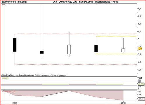 Wir sehen in obigem Quartalschart (1 Kerze = 1 Quartal) dass die Kerze des 1. Quartals 2009 die grosse Bandbreite für einen Seitwärtstrend vorgibt. Die obere Begrenzung des pink Trends liegt bei € 1.14, die untere bei € 0.34. Der Trend ist so lange in Kraft, als sich die Zahl der schwarzen und weissen Kerzen in etwa die Waage halten und die Schlusskurse sich innerhalb des Trends befinden. Schwarze und weisse Kerzen wechseln sich in der Mitte des Trends ab, was die Richtungslosigkeit des Kurses unterstreicht. Erst mit einem Ausbruch aus diesem Seitwärtstrend bekommt Conergy wieder eine Richtung und neue Dynamik. Dafür sind zur Zeit allerdings noch keine Anzeichen zu erkennen. Im Gegenteil, mit jeder Kerze wird ein neuer, engerer Seitwärtstrend vorgegeben und der Kurs der Conergy AG wird so richtig in ein enges Korsett geschnürt, aus dem er sich nicht so leicht wird berfreien können. Die Bandbreite des hellgelben, inneren Seitwärtstrends beträgt von € 0.62 unten bis € 1.07 oben. Es ist durchaus möglich, dass dieser oder der grössere pinkfarbene Seitwärtstrend bis 2011 anhält.