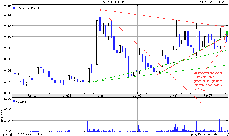 sub-sahara steht kurz jetzt kurz vor dem Ausbruch nach oben wenn der Goldpreis mit spielt.Im Anhang bekommt Ihr die neueste Meldung. http://www.subsahara.com.au/reports/broker/...tation-Broker3-7-07.pdf
