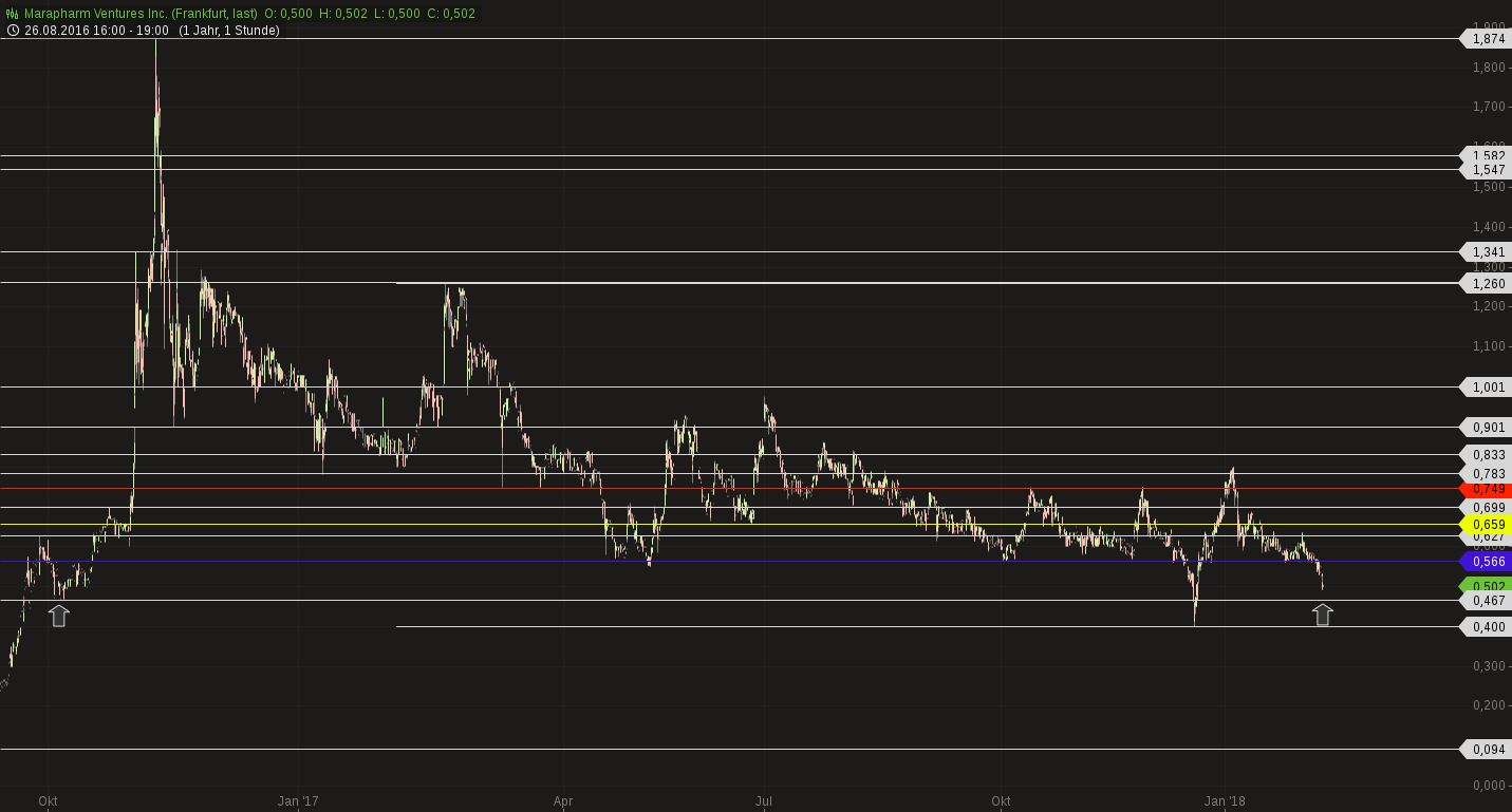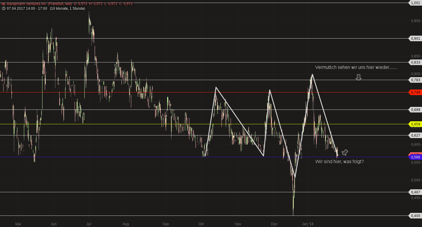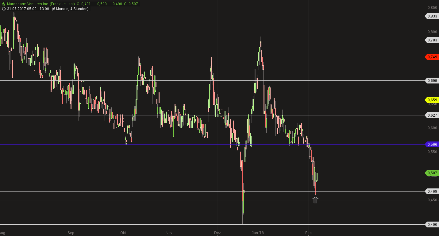 Die Post ging nicht ab leider zeigt der Chart den nächsten Halt erst bei 0,47 €. Es fehlen Pressemitt­eilungen von Marapharm über derzeitige­ Tätigkeite­n oder Erfolge. Der allgemeine­ Niedergang­ der Aktienwelt­ tut sein Übriges um Mara nach unten zu schicken. Sollte die Marke nicht halten ist die letzte Chance bei 0,40 € danach sehe ich längere Zeit kein Land mehr = Verkauf. Man muß dann einen eventuelle­n Wiedereins­tieg auf die 0,48 € legen um bei einen Anstieg dabei zu sein.
