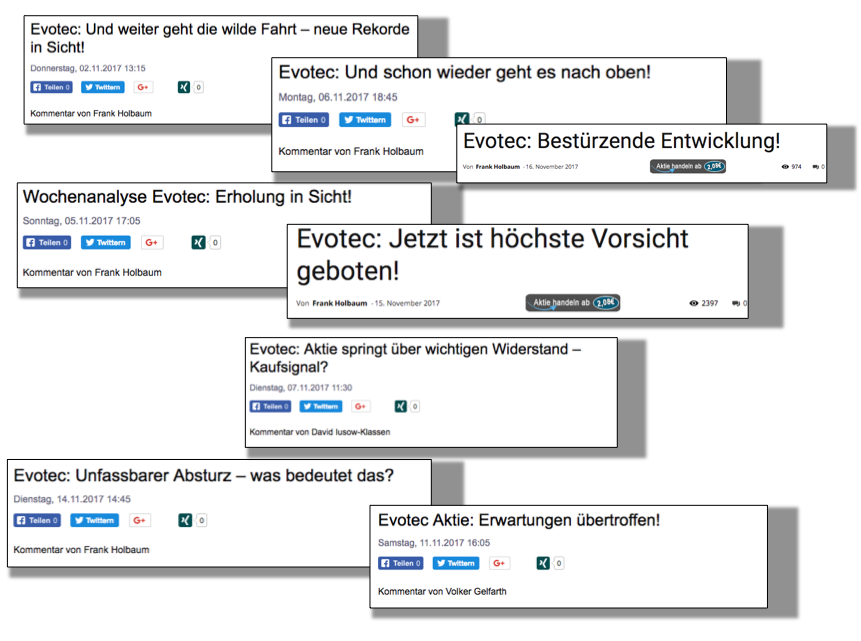 Den Müll, der bei Ariva immer als "News" angezeigt wird lese ich aus Prinzip nicht, weil es entweder eigennütziger Schwachsinn des Herausgebers ist, oder, in anderen Fällen, nicht mal eigennütziger, sondern komplett irrelevanter Schwachsinn. Der einzige Grund warum diese News gelesen und immer wieder zitiert werden sind die reisserischen Überschriften, welche allerdings mit dem dazugehörigen folgenden Text überhaupt nichts zu tun haben. Beispiele (Headlines von Frank Holbaum von Finanztrends, der diesjährige heisseste Kandidat für den Pulitzerpreis) siehe Grafik. Innerhalb von nur 2 Wochen kommt hier ein dramatisches Wechselbad der Gefühle. Ich empfehle dem Springerverlag den Mann mal einzuladen damit die bei der Bild lernen wie man Überschriften macht.