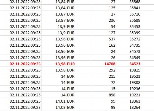Schaut man sich das Orderbuch noch genauer an (Sekundenbereich), dann sieht man dass um 9:25 :01 insgesamt 17008 Aktien gehandelt wurden. Da ich aber nicht weiß wie der Zeitstempel konkret zustande kommt, hilft das auch nicht wirklich. Deine 15000 sind wohl die 14708 plus die 292 in der Zeile darunter.