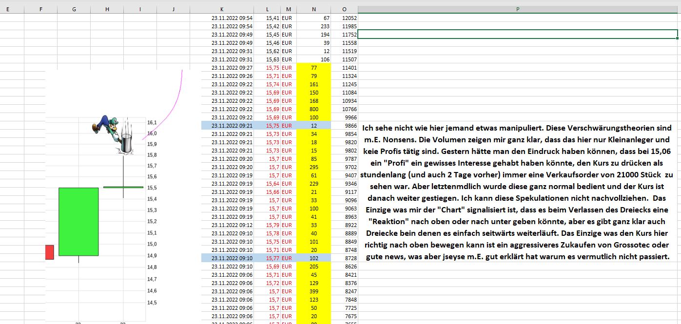 Eure Theorie ist falsch. Am 23.11. ist der Kurs auf Xetra um 2,2% gestiegen! Die BaFin kann doch nicht Käufer animieren und Verkäufer zurückhalten. Es ist doch so, dass Trader am Werk sind, wie in jeder Aktie. Als Trader bei 14.8 kaufen und bei 15,8 verkaufen (+6,7%) ist ein gutes Geschäft. Wenn alle Trader, die zu niedrigen Kursen gekauft haben raus sind, dann kann es steigen, wenn auch Käufer da sind. So kommt es zu den Formationen im Chart.