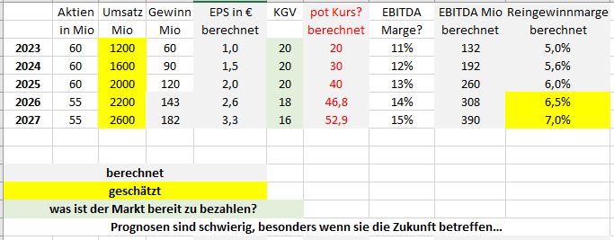 Für ein erneutes KGV von 20 für 2026 müsste aus meiner Betrachtungsweise 2025 schon ein Ausblick da sein, der bei einer dann erreichten EBITDA Marge von 13% weitere zusätzliche positive Aspekte beinhaltet. z.B. weiter wachsende EBITDA Marge und höhere Reingewinnmarge (schauen wir wo die effektive Aktienzahl dann liegt) oder z.B. ein deutlich zweistelliges EBITDA Wachstum für 2026ff.
