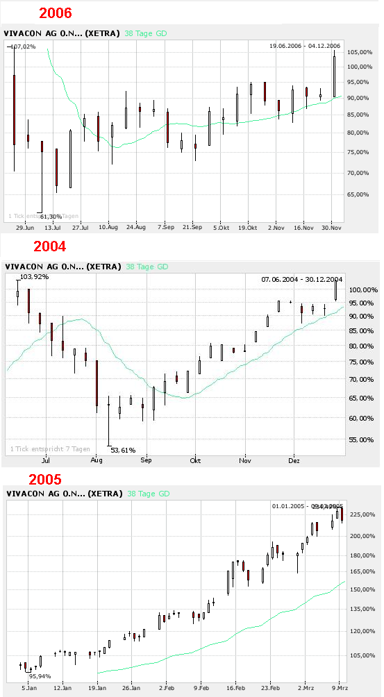 Nachdem es eine allgemeine Sommerflaute gegeben hatte (DAX fiel seinerzeit von 4070 auf 3647) musste auch die Vivacon Federn lassen, erholte sich aber wieder bis zum Jahresende auf den Höchstkurs Mai 2004 (DAX schloss mit 4261).