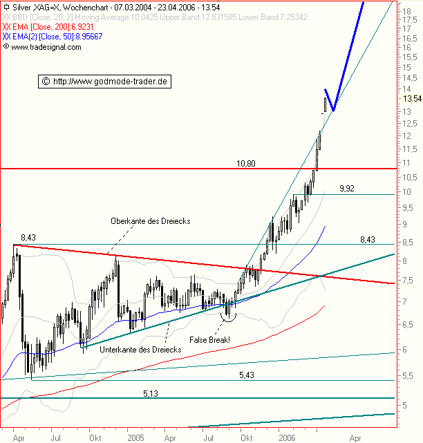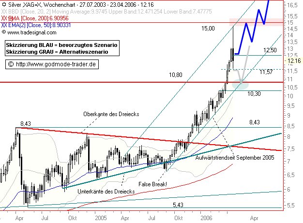 Rückblick: SILBER befindet sich in einer mittelfristigen Aufwärtsbewegung. Von April 2004 bis November 2005 pendelte das Edelmetall 19 Monate lang seitwärts in einem bullischen Dreieck, welches regelkonform nach oben hin aufgelöst wurde. Es folgte eine steile Rallye, welche sich nach dem Anstieg über den Horizontalwiderstand bei 10,80 $ Ende März 2006 extrem beschleunigte. Am 19.04.2006 erreichte SILBER schließlich den Widerstandsbereich bei 14,50 - 15,30 $ und rutschte am Folgetag crashartig nach unten ab. Dabei korrigierte das Edelmetall fast bis ans 61,8% Fibonacci Retracement der Aufwärtsbewegung seit März 2006 bei 11,57 $. Aktuell erholt sich SILBER wieder und versucht eine Rückkehr über 12,50 $.