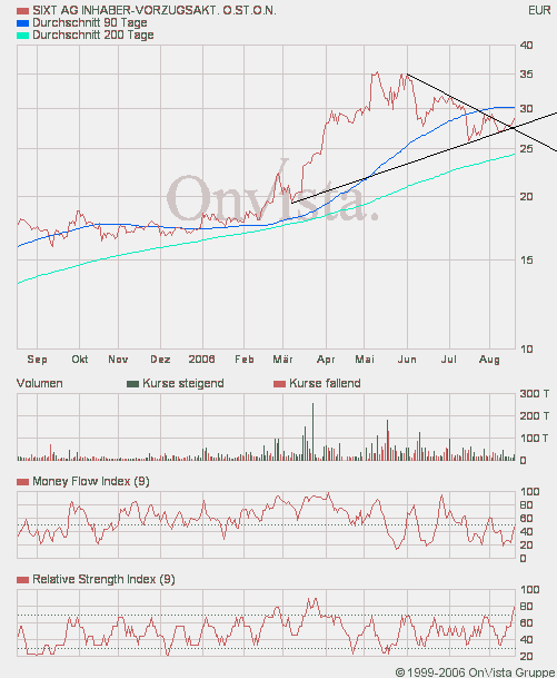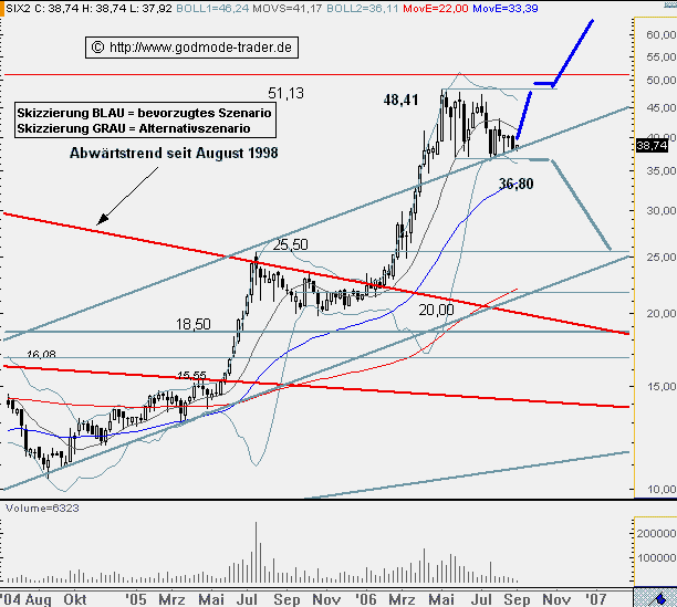 Rückblick: Die SIXT Aktie startete im Mai 2003 eine Aufwärtsbewegung innerhalb eines Trendkanals. Innerhalb dieses Kanals brach die Aktie im Januar 2006 über den primären Abwärtstrend aus. In der letzten Märzwoche durchbrach die Aktie die obere Begrenzung dieses Kanals und stieg in einer schnellen Rallye auf 48,41 Euro an. Seit diesem Hoch von Anfang Mai befindet sich die Aktie in einer Seitwärtsbewegung zwischen diesem Hoch und 26,80 Euro. Zusätzlich unterstützt wird die Aktie durch die obere Begrenzung des Aufwärtstrendkanals. Diese liegt in der laufenden Woche bei 38,04 Euro