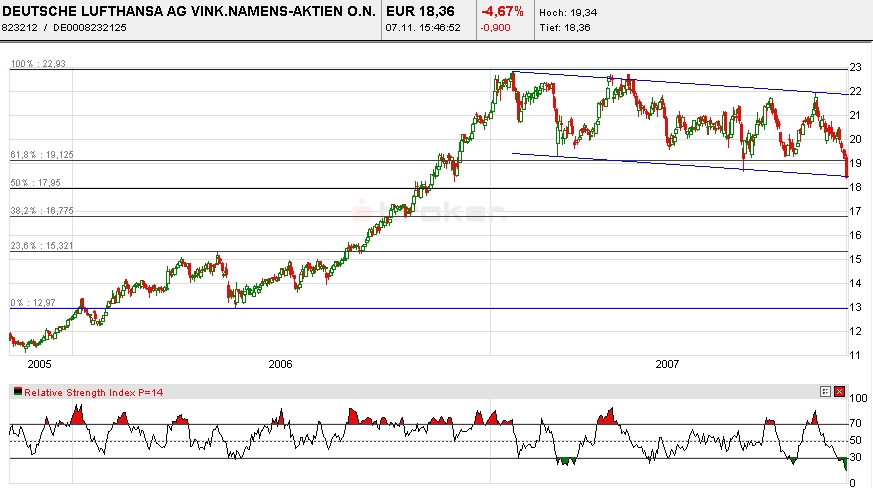 08.11.2007 - Die Analysten von Goldman Sachs sprechen eine Verkaufsempfehlung für Lufthansa-Aktien aus. Zuvor stand ihr Rating bei „neutral“. Gleichzeitig wird die Aktie auf die „conviction sell list“ gesetzt. Das Kursziel wird von 20,00 Euro auf 17,50 Euro reduziert.