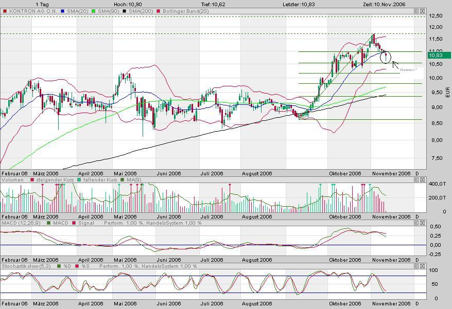 Ein erstes Kursziel wäre dann tatsächlich die 12.50€, und im Anschluss bin ich gespannt, ob wir im Trendkanal bleiben. ... nicht aus Geldgier, sondern weil Kontron bisher jedes Jahr nur bis circa Februar/ März gut performt. Danach war der Ofen aus und eine Seitwärtsbewegung dauerte den gesamten Sommer. Somit könnten wir bei einem Verbleiben im Trendkanal die 11 Euro im Sept 07 wieder sehen, was für die Kursentwicklung im Vergleich mit der Geschäftsentwicklung enttäuschend wäre. Daher kann es mE alternativ in einer Übertreibung gut sein, dass wir bis in Regionen um die 14 bis Februar vorstoßen, um denn über den Sommer bis auf 12,50 - 13 Euro zu konsolidieren.