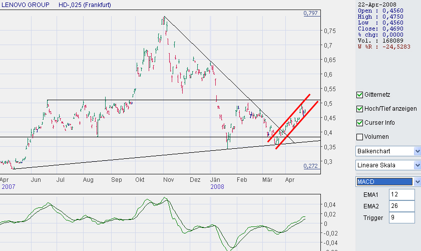 Aktuell würde ich fast zum Abwarten beim Kauf raten. Überlege auch ein wenig nachzulegen, allerdings gefällt mir die Situation in Tibet nicht. Für Lenovo als internationales Branding sind die Spiele mehr als wichtig. Daher trifft jede Drohung eines Olympiaboykotts auch Lenovo. Zudem ist die Lage an den Börsen mehr als prekär.