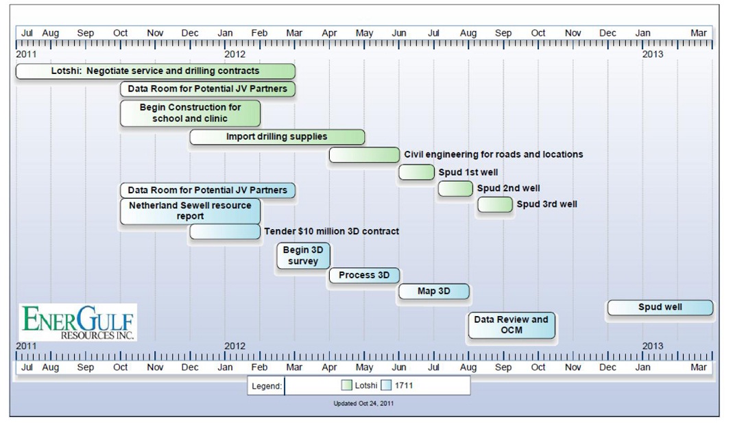 The Company intends to secure a JV participant in the first half of 2013. A prospective resource report for Block 1711 was prepared covering four prospects and nine leads. The report includes a mean estimate of 3,166,000,000 barrels of potentially recoverable oil. The report was prepared by independent oil and natural gas reservoir engineers Netherland Sewell and Associates Inc. of Dallas, Texas, and is available on SEDAR and the EnerGulf website. EnerGulf has a 15% working interest in Block 1711. The upcoming work program calls for a 3D seismic program in the southern part of the Block with a follow up well.