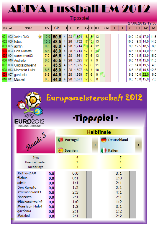 lassen wir uns überraschen.. Jedenfalls sieht man aber - sind nur 2 Spiele, aber die Top 10 sind kunterbunt beim tippen.. Also Kampf ist noch vorprogrammiert.. Und sollte gar Portugal gewinnen, dann wirds mehr als eng in den Top 10.. dann knistert es nochmal richtig.. Gewinnt Spanien, wird der Kreis der Meisterschaftsfavoriten noch kleiner, dann haben nur noch knapp 5-6 Tipper die Chancen auf den Titel..