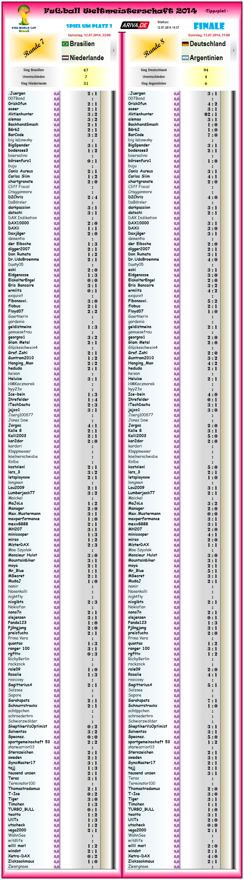WM2014 Tippspiel Runde 7&8 aktuell 104&103Tipps