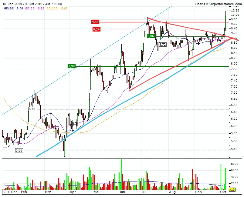 Und durch den Anstieg der letzten Tage, macht das Chartbild richtig Freude und Hoffnung auf mehr! Der Aufwärtstrend ist weiter stabil und der Ausbruch aus dem Keil nach oben ist gelungen. Die 9,30-9,65€ Zone wird eine schöne Unterstützung bilden!