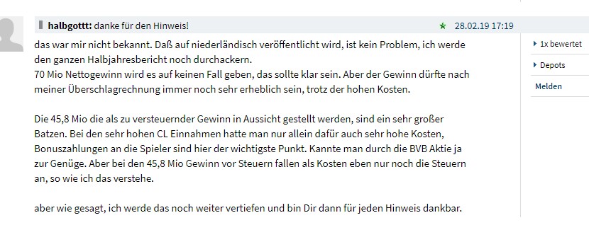 Aber wie gesagt, solche ewig langen und gestrigen Auseinandersetzungen sind viel zu zeitaufwendig und sowieso vollkommen nutzlos. Dafür ist meine Zeit echt zu schade. Das habe ich jahrelang vollkommen umsonst gemacht, zwar ging die BVB Aktie von 1 auf 7 hoch und ich war dabei, aber garniert mit tausenden vollkommen idiotischen Auseinandersetzungen, die ich mir komplett hätte ersparen sollen.