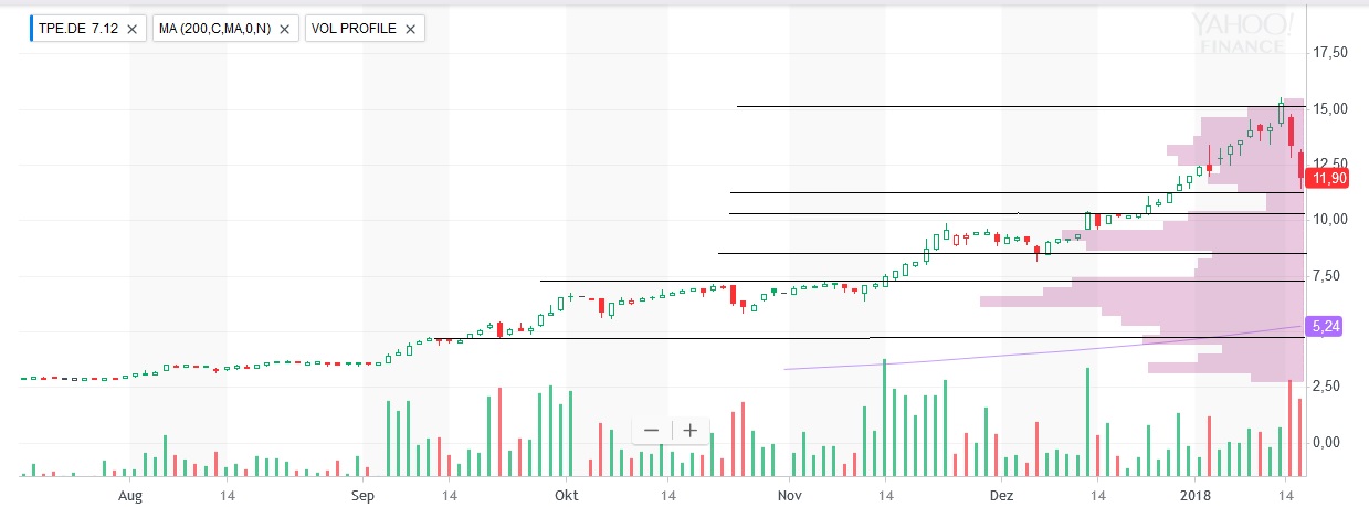 so lange wir uns oberhalb der ~11 Euro bewegen übt die High Volume Area 11,18-15 die stärkere Anziehungskraft aus. Da der langfistige Trend Up ist bestehen also knapp unterhalb dieser Area sehr gute Wahrscheinlichkeiten, dass es wieder hoch geht. Gefährlich wird es aber unter 11 Euro, dann hätte die High Volume Area von 8,5-10,5 eine stärkere Anziehungskraft und kann den Kurs weiter runter ziehen. Dafür würde auch sprechen, dass sie einen stärkeren Point of Control (Peak) hat als die obere High Volume Area, dagegen spricht, dass wie gesagt der Trend langfristig Up ist.