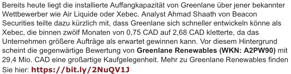 Unsere Erstempfehlung zu Greenlane Renewables finden Sie unter dem folgenden Link: https://bit.ly/2NuQV1J
