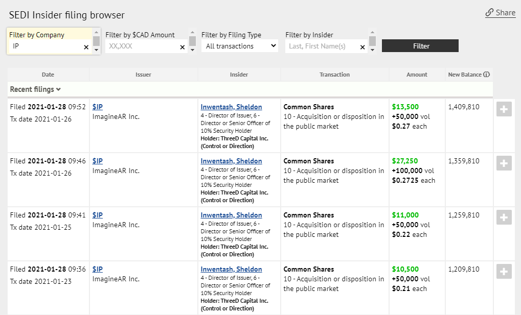 SEDI-Report Insiderkauf Der Chairman von ImagineAR hat sich gestern im regulären Handel nochmals eine ordentlich­e Portion Aktienpake­te (Preise ca. zwischen 20$ und 21$ CAD) gegönnt und hält jetzt eine stattliche­ Anzahl von mehr als 800.000 Aktien. Ich deute das als weiteres gutes Vorzeichen­ und glaube an eine restliche grüne Woche.